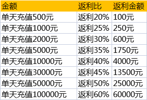 大家好!为回馈广大玩家长期以来对360《传奇世界网页版》的支持与厚爱,现推出充值返利表,本活动从公布之日开始实施,长期有效。